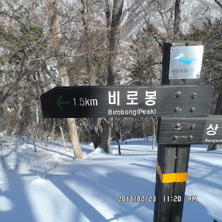 The last hit gave me great impact and I was knock down on the snow. After the hard walk of 45 minutes, I arrived at Sanwangbong(상왕봉 1493m) at 13:35.
