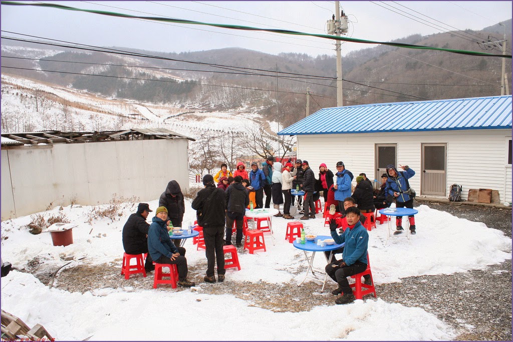 バスは出発予定地の3キロ前までは順調に走ったが、道路の標高が高いのと、路面凍結のため、3キロ前でストップ。全員下車して出発点のサリジェ(싸리재)[トゥムンドン(두문동재)まで歩いた。