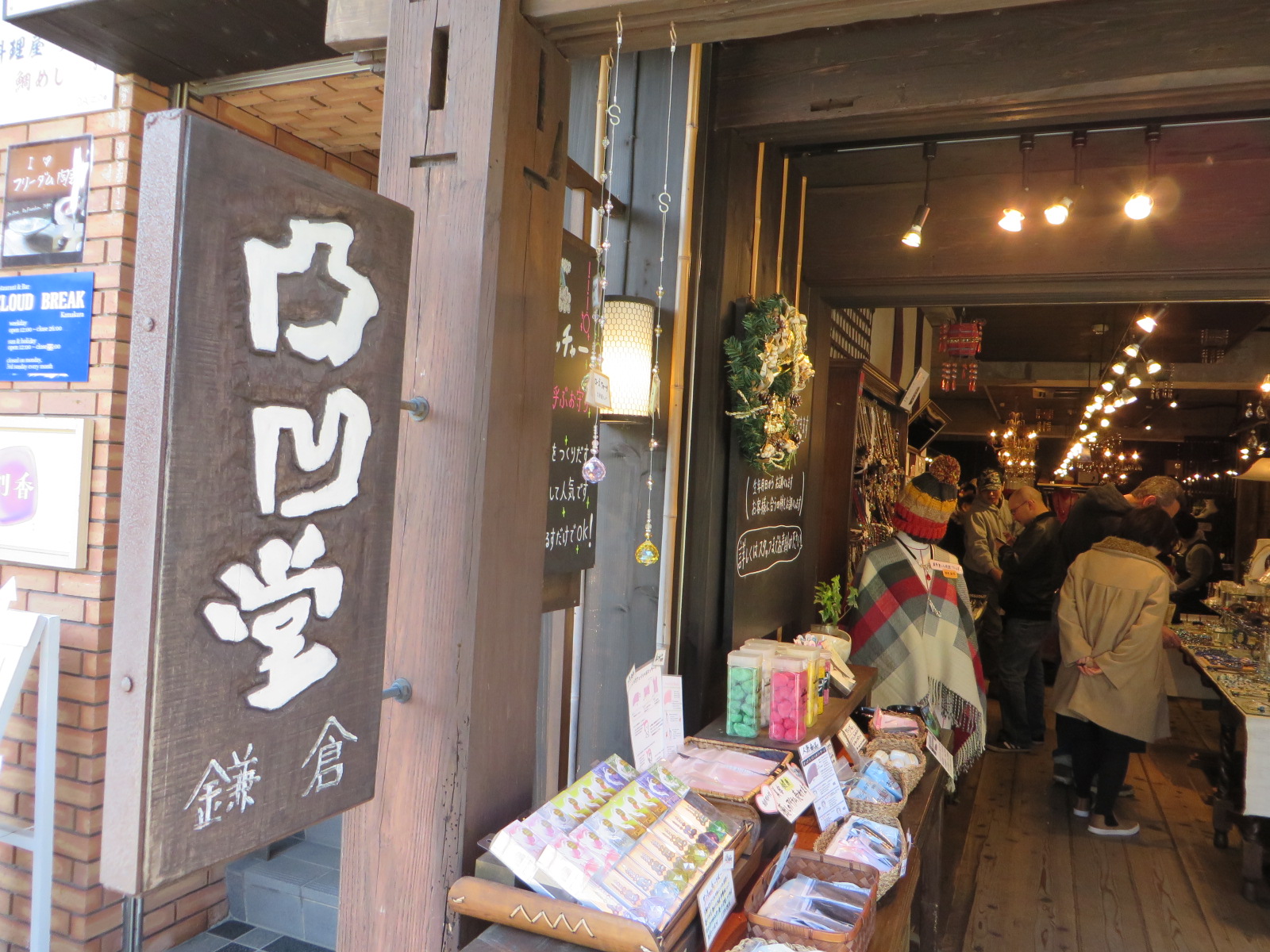 この後、道路の反対側を八幡宮に向かって歩いたが、二人は凸凹堂という風変わりな名前の小物屋に引っかかり、お土産選びにたいそう時間をかけた。
