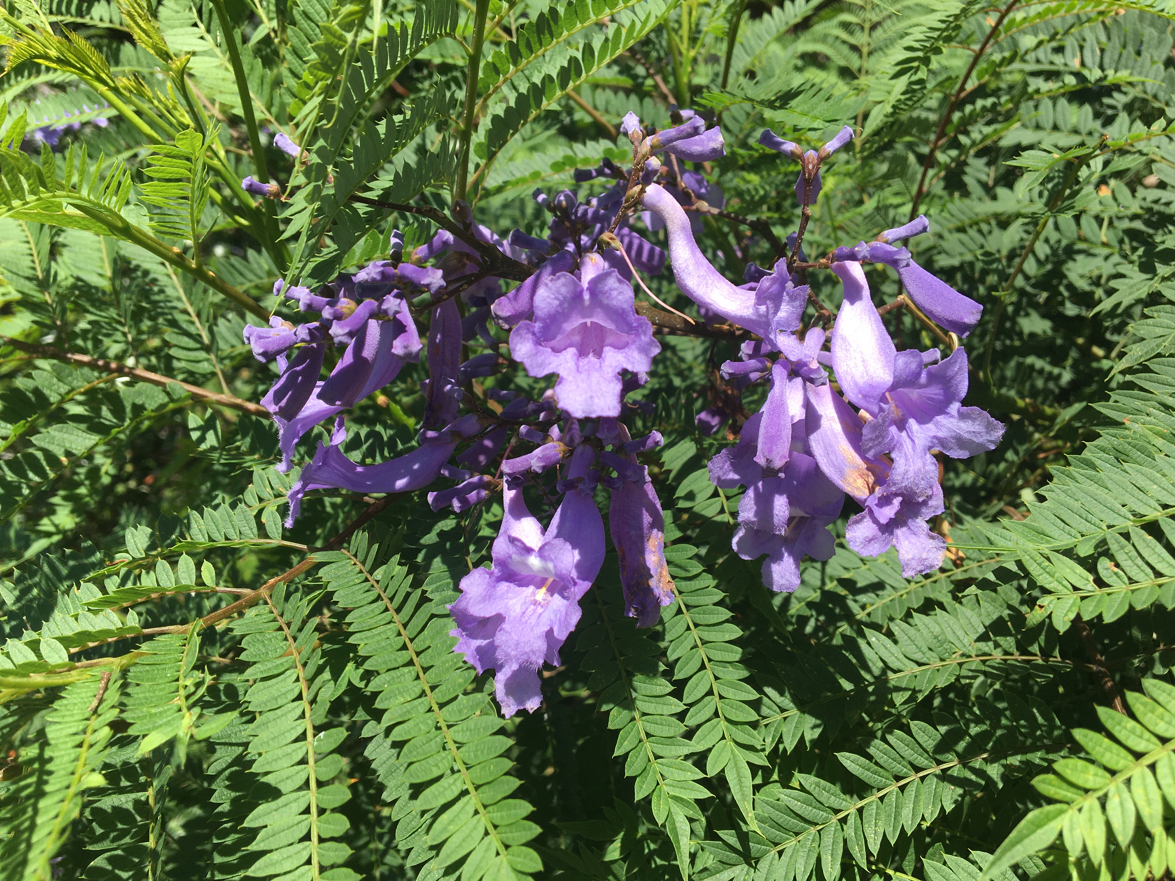 日本の桜は1週間から2週間で散ってしまうが、このジャカランダはなんと12月中旬過ぎてもまだ残っているものがある。さすがに11月も終わるころ咲くジャカランダは葉も同時に出るので「葉桜」ならぬ「葉ジャカランダ」である。また、その葉は、「羽状複葉」と呼ばれるものでネムノキの葉にそっくりである。